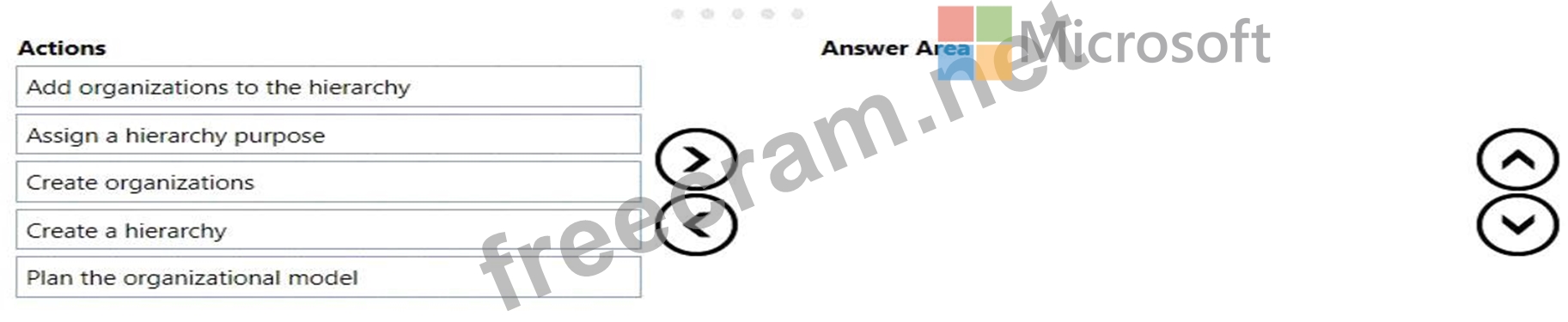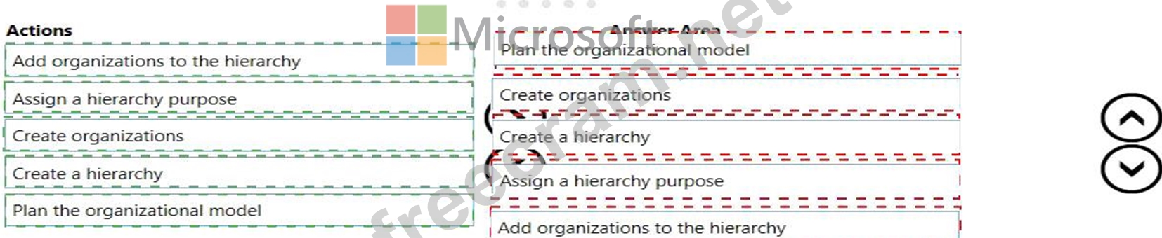 In which order should you recommend that actions be performed to create an organizational hierarchy? To answer, move all actions from the list of actions to the answer area and arrange them in the correct order.