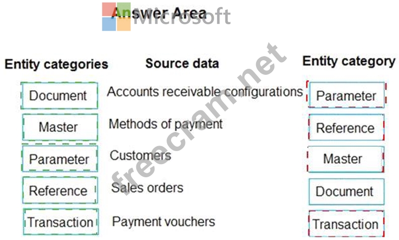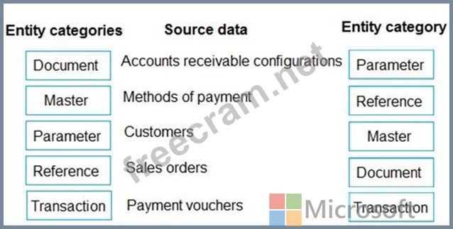 Which entity categories should you use? To answer, drag the appropriate entity categories to the correct source data. Each entity category may be used once, more than once, or not at all. You may need to drag the split bar between panes or scroll to view content.