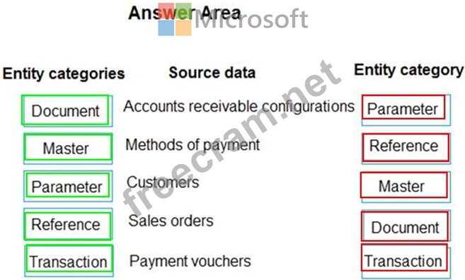 Which entity categories should you use? To answer, drag the appropriate entity categories to the correct source dat a. Each entity category may be used once, more than once, or not at all. You may need to drag the split bar between panes or scroll to view content.