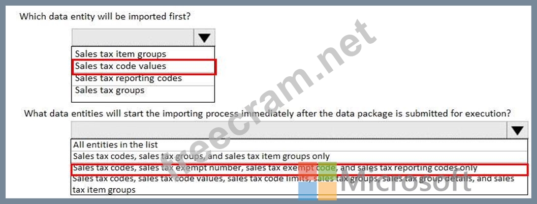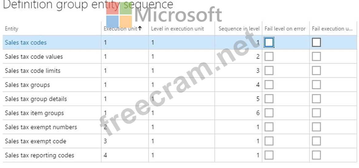 A company sets up a data package to import data by using the data management framework. You have the following data entity sequence.