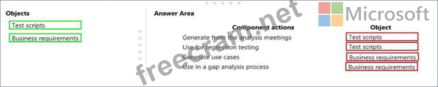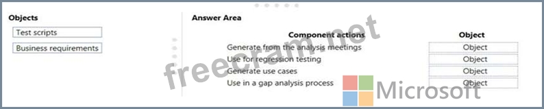Which business objects should you use? To answer, drag the appropriate objects to the correct component actions. Each object may be used once, more than once, or not at all. You may need to drag the split bar between panes or scroll to view content.