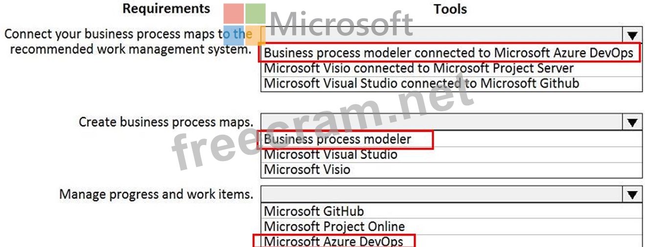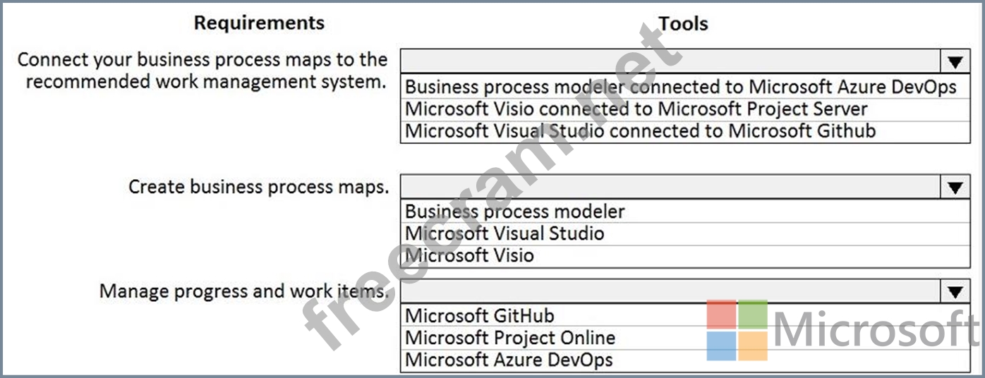 You review business processes and their associated requirements. These work items include bugs, tasks backlog items, tests, and documents You need to perform the following tasks:
