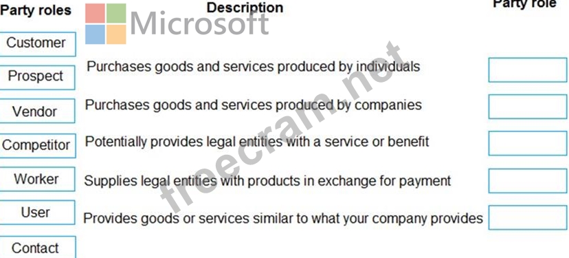 Which party roles should you use? To answer, drag the appropriate party roles to the correct descriptions. Each party role may be used once, more than once, or not at all. You may need to drag the split bat between panes or scroll to view content.