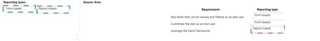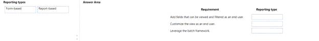 Which base reporting type objects should be used? To answer, drag the appropriate reporting type to the correct requirements. Each reporting type to leverage may be used once, more than once, or not at all. You may need to drag the split bar between panes or scroll to view content NOT: Each correct selection is worth one point.