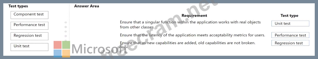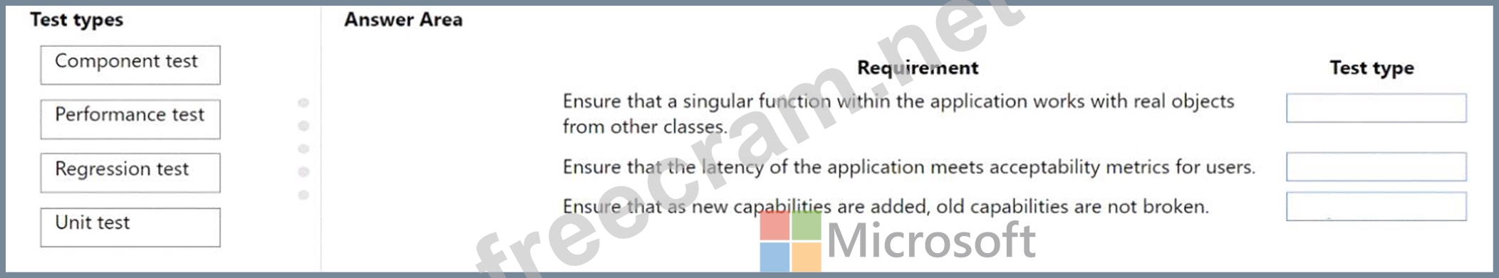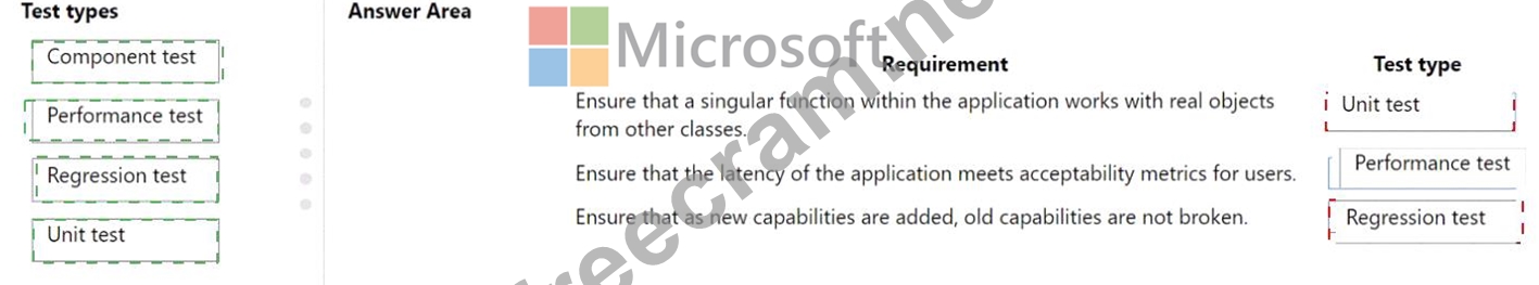 Which tests should you perform? To answer, drag the appropriate test types to the correct requirements. Each test type may be used once, more than once, or not at all. You may need to drag the split bar between panes or scroll to view content.