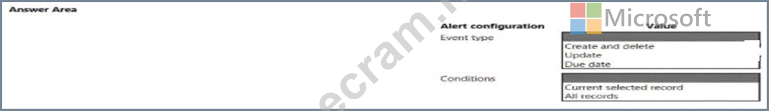 Which alert configurations should you use? To answer, select the appropriate options in the answer area.