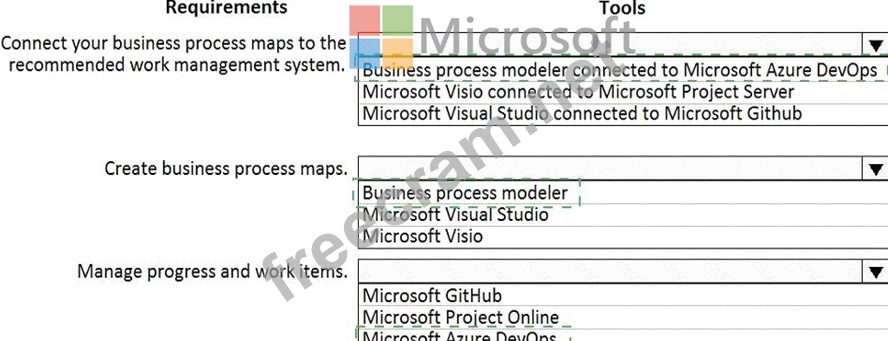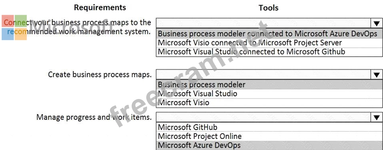 You review business processes and their associated requirements. These work items include bugs, tasks backlog items, tests, and documents You need to perform the following tasks: