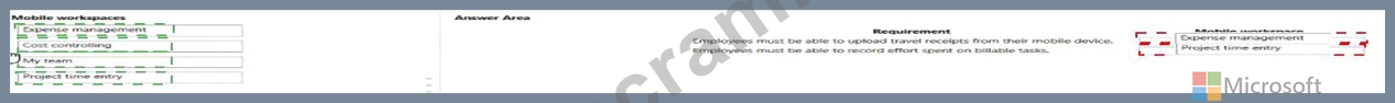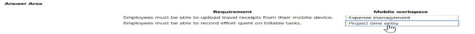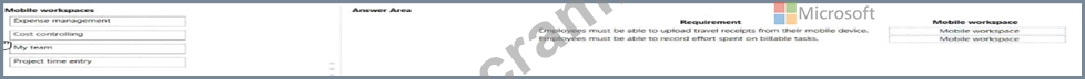 Which mobile workspaces should you use? Answer, drag the appropriate mobile workspaces to the correct requirements. Each mobile workspace may be used once, more than once, or not at all. You may need to drag to drag the split bar between panes or scroll to view content.