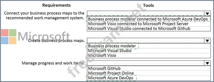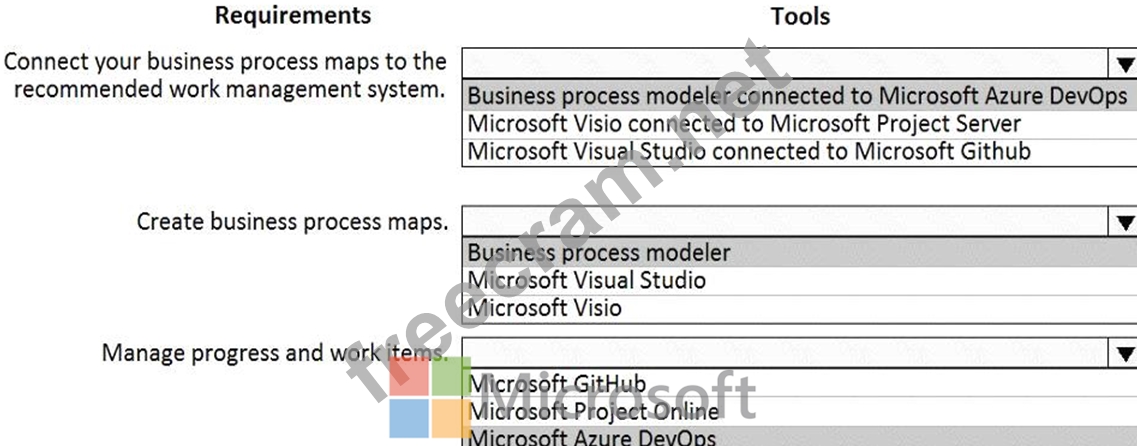 You review business processes and their associated requirements. These work items include bugs, tasks backlog items, tests, and documents You need to perform the following tasks: