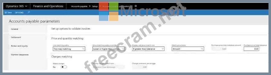 You need to configure invoice validation for vendors in Dynamics 365 for Finance and Operations. You are viewing the Accounts payable parameter for Invoice validation.