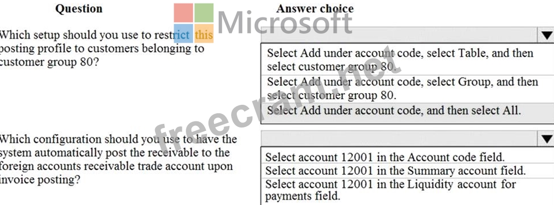 A client is using Dynamics 365 Finance for sales order processing and accounts receivable. The client has two customer groups and two Accounts receivable trade accounts. Foreign customers in Group 80 are assigned to account 12001. Domestic customers in Group 40 are assigned to account 12000.