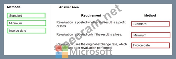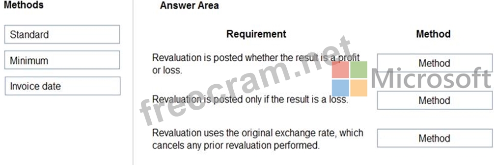 Which currency revaluation method should you use for each requirement? To answer, drag the appropriate methods to the correct requirements. Each method may be used once, more than once, or not at all. You may need to drag the split bar between panes or scroll to view content.