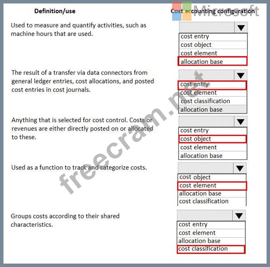 A client plans to use the cost accounting module in Dynamics 365 for Finance and Operations. You need to associate the correct definitions to the correct cost accounting concepts. Which terms match the definitions? To answer, select the appropriate configuration in the answer are3. NOTE: Each correct selection is worth one point.