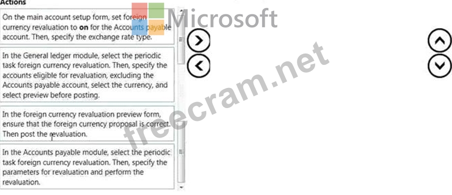 You need to set up Dynamics 365 for Finance and Operations to perform foreign currency revaluation, In which order should you perform the actions? To answer, move all actions from the list of actions to the answer area and arrange them in the correct order.
