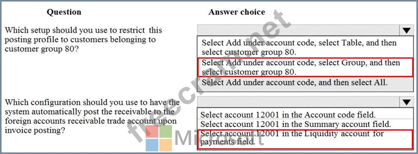 A client is using Dynamics 365 Finance for sales order processing and accounts receivable. The client has two customer groups and two Accounts receivable trade accounts. Foreign customers in Group 80 are assigned to account 12001. Domestic customers in Group 40 are assigned to account 12000.