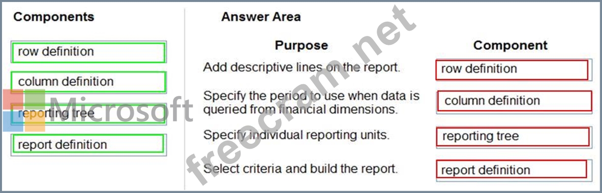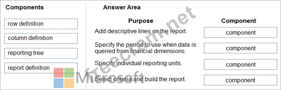 Which report components should you use for each purpose? To answer, drag the appropriate component to the correct purpose. Each component may be used once, more than once, or not at all. You may need to drag the split bar between panes or scroll to view content.