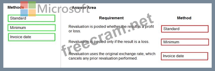 Which currency revaluation method should you use for each requirement? To answer, drag the appropriate methods to the correct requirements. Each method may be used once, more than once, or not at all. You may need to drag the split bar between panes or scroll to view content.