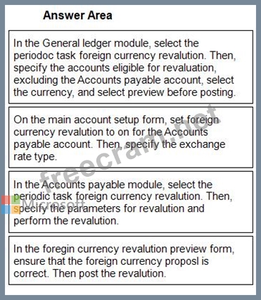 You need to set up Dynamics 365 for Finance and Operations to perform foreign currency revaluation, In which order should you perform the actions? To answer, move all actions from the list of actions to the answer area and arrange them in the correct order.
