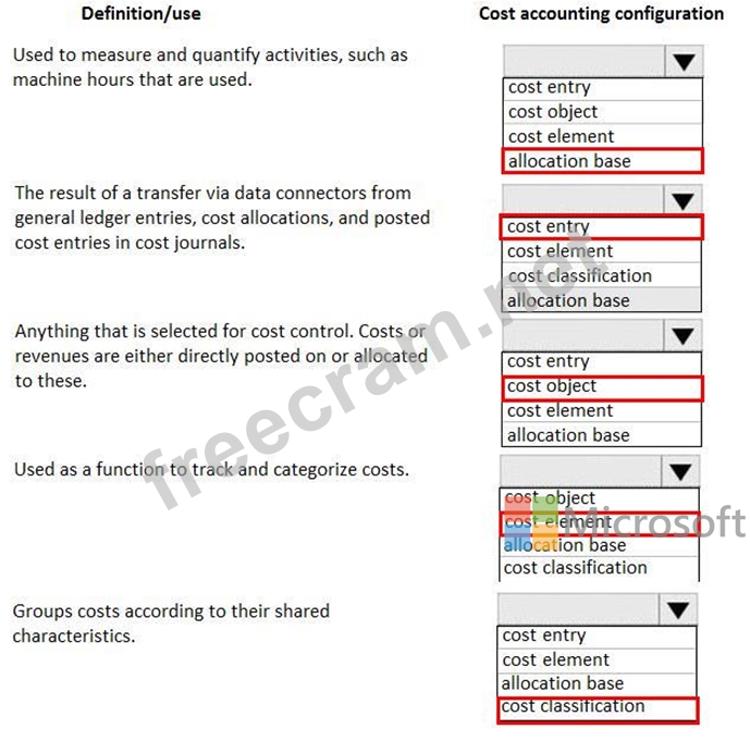 A client plans to use the cost accounting module in Dynamics 365 for Finance and Operations. You need to associate the correct definitions to the correct cost accounting concepts. Which terms match the definitions? To answer, select the appropriate configuration in the answer are3. NOTE: Each correct selection is worth one point.