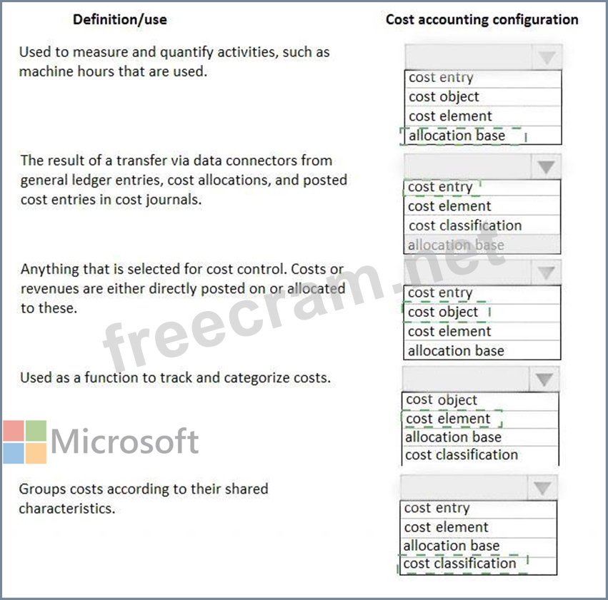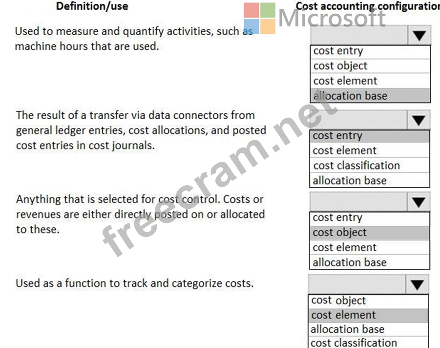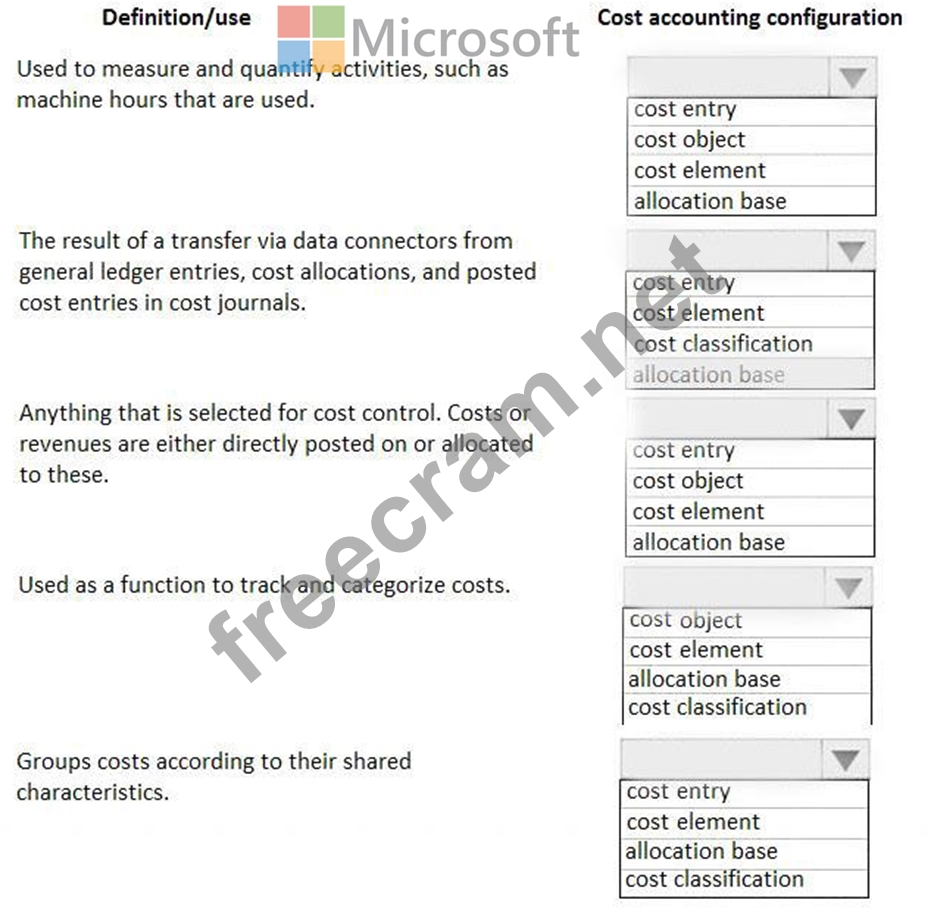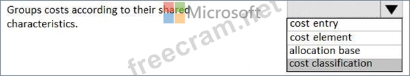 A client plans to use the cost accounting module in Dynamics 365 for Finance and Operations. You need to associate the correct definitions to the correct cost accounting concepts. Which terms match the definitions?