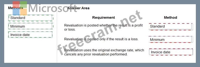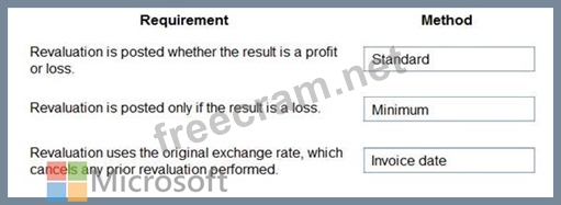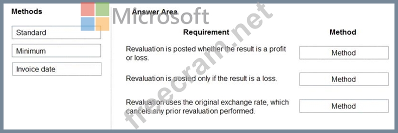 Which currency revaluation method should you use for each requirement? To answer, drag the appropriate methods to the correct requirements. Each method may be used once, more than once, or not at all. You may need to drag the split bar between panes or scroll to view content.