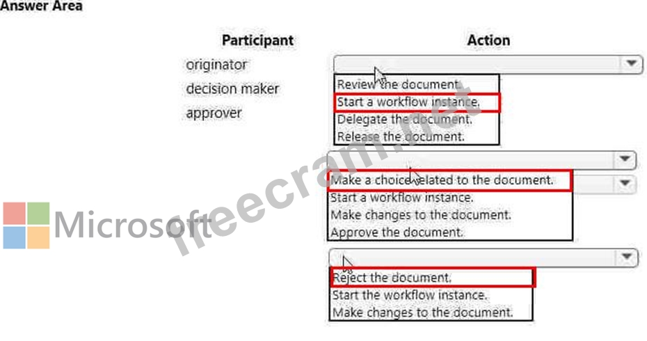 You are setting up of the process for an expense report approval in Dynamics 365 for Finance and Operations. You need to assign permission for each participant in the workflow approval process to perform their tasks. Which action can each participant perform? To answer, select the appropriate option in the answer area. NOTE: Each correct selection is worth one point.