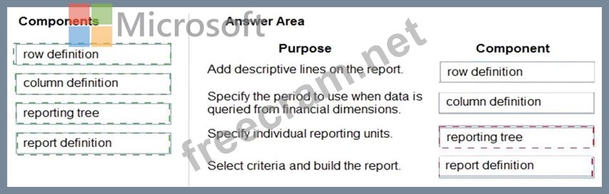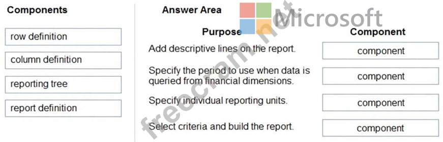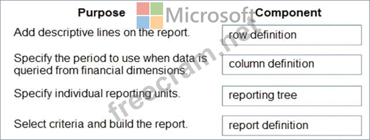 Which report components should you use for each purpose? To answer, drag the appropriate component to the correct purpose. Each component may be used once, more than once, or not at all. You may need to drag the split bar between panes or scroll to view content.