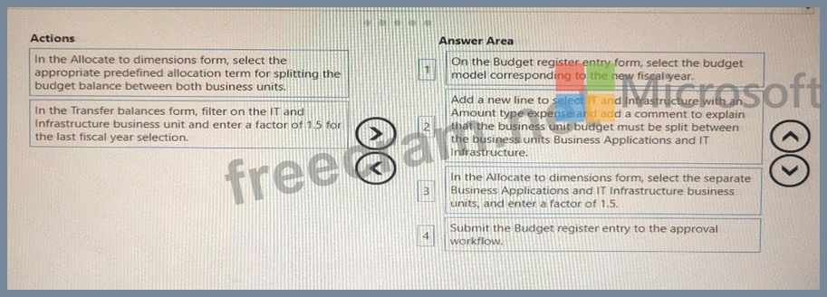 You need to create the budget for the two business units based on 1.5 Which four actions should you perform in sequence? To answer, move the appropriate actions from the list of actions to the answer area and arrange them in the correct order.