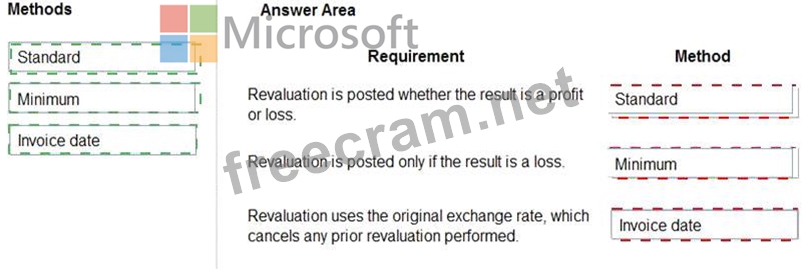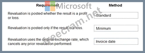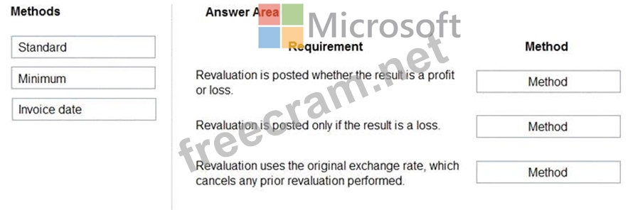 Which currency revaluation method should you use for each requirement? To answer, drag the appropriate methods to the correct requirements. Each method may be used once, more than once, or not at all. You may need to drag the split bar between panes or scroll to view content.