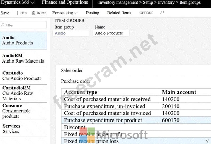The Audio Item group posting for a purchase order is configured as shown: