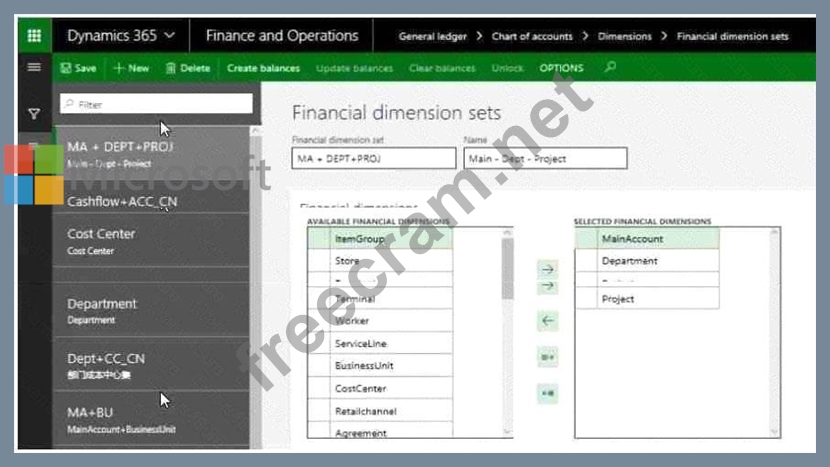You Create a financial dimension set named MA + DEPT+PROJ as shown in the following screenshot. The financial dimension set include the following dimensions: