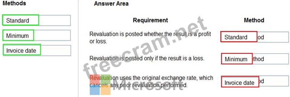 Which currency revaluation method should you use for each requirement? To answer, drag the appropriate methods to the correct requirements. Each method may be used once, more than once, or not at all. You may need to drag the split bar between panes or scroll to view content.