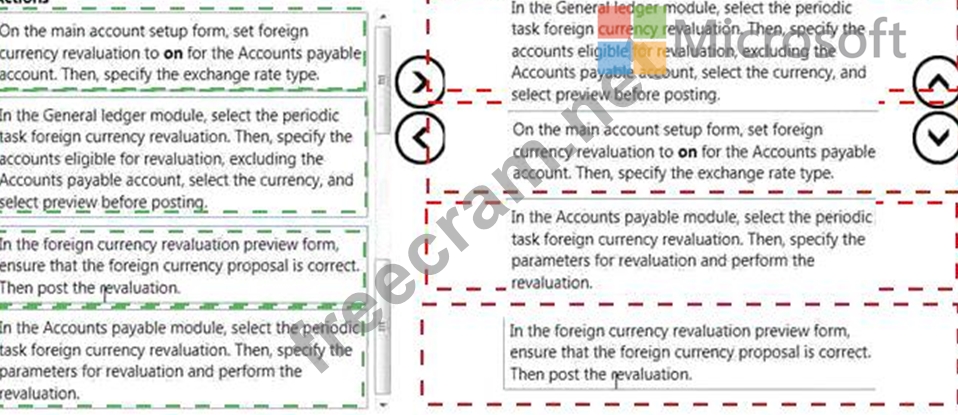 You need to set up Dynamics 365 for Finance and Operations to perform foreign currency revaluation, In which order should you perform the actions? To answer, move all actions from the list of actions to the answer area and arrange them in the correct order.