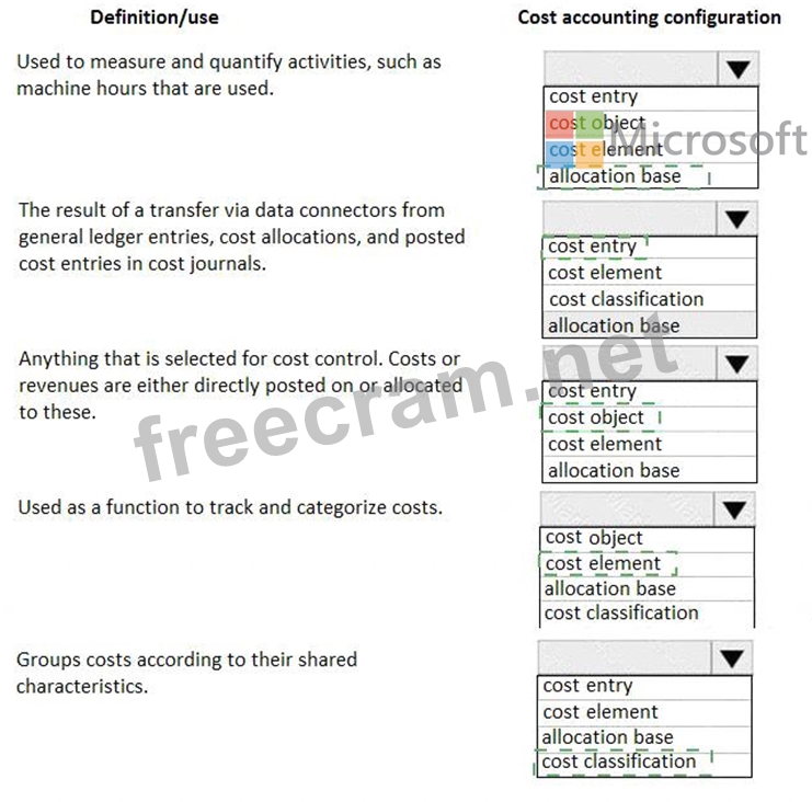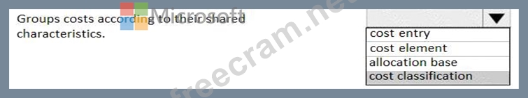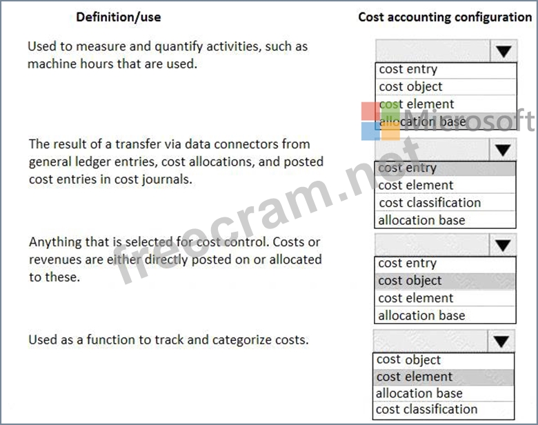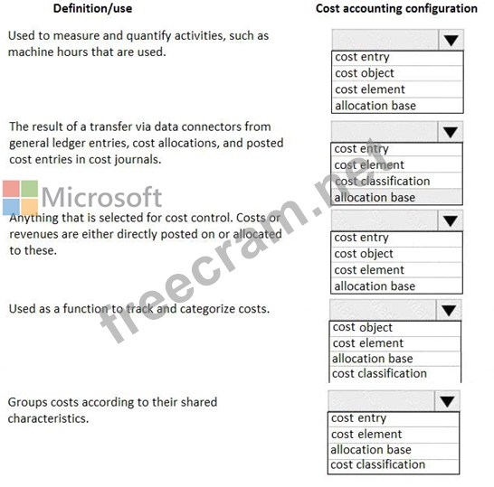 A client plans to use the cost accounting module in Dynamics 365 for Finance and Operations. You need to associate the correct definitions to the correct cost accounting concepts. Which terms match the definitions?