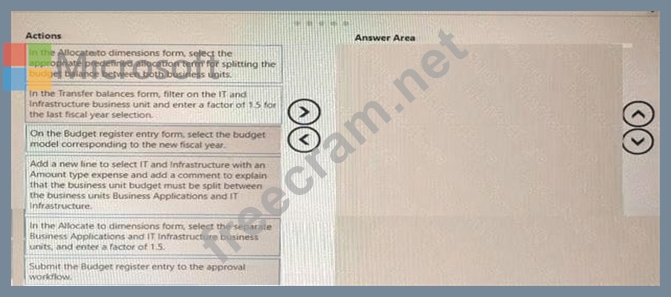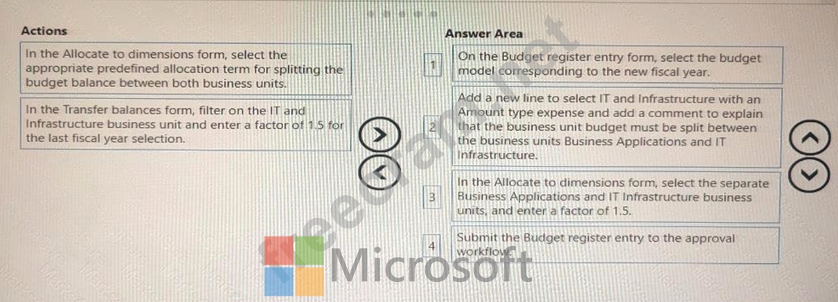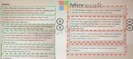 You need to create the budget for the two business units based on 1.5 Which four actions should you perform in sequence? To answer, move the appropriate actions from the list of actions to the answer area and arrange them in the correct order.