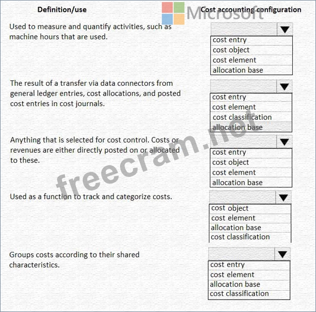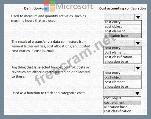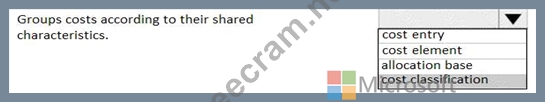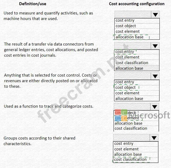 A client plans to use the cost accounting module in Dynamics 365 for Finance and Operations. You need to associate the correct definitions to the correct cost accounting concepts. Which terms match the definitions?