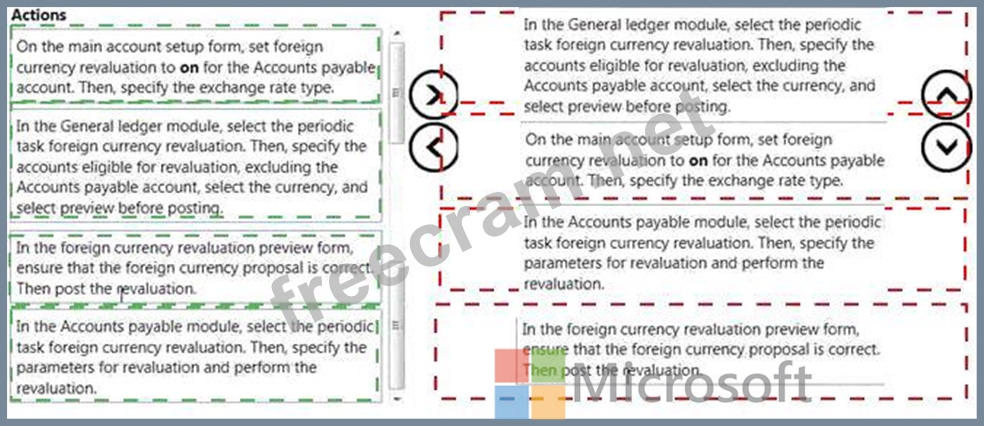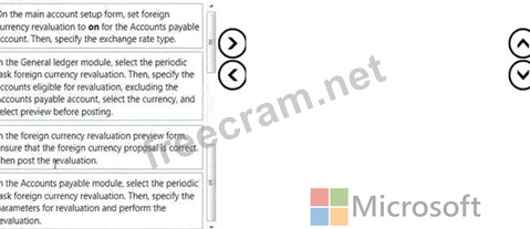 You need to set up Dynamics 365 for Finance and Operations to perform foreign currency revaluation, In which order should you perform the actions? To answer, move all actions from the list of actions to the answer area and arrange them in the correct order.
