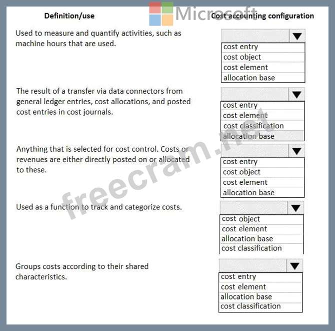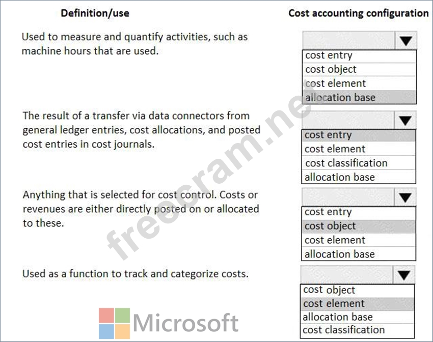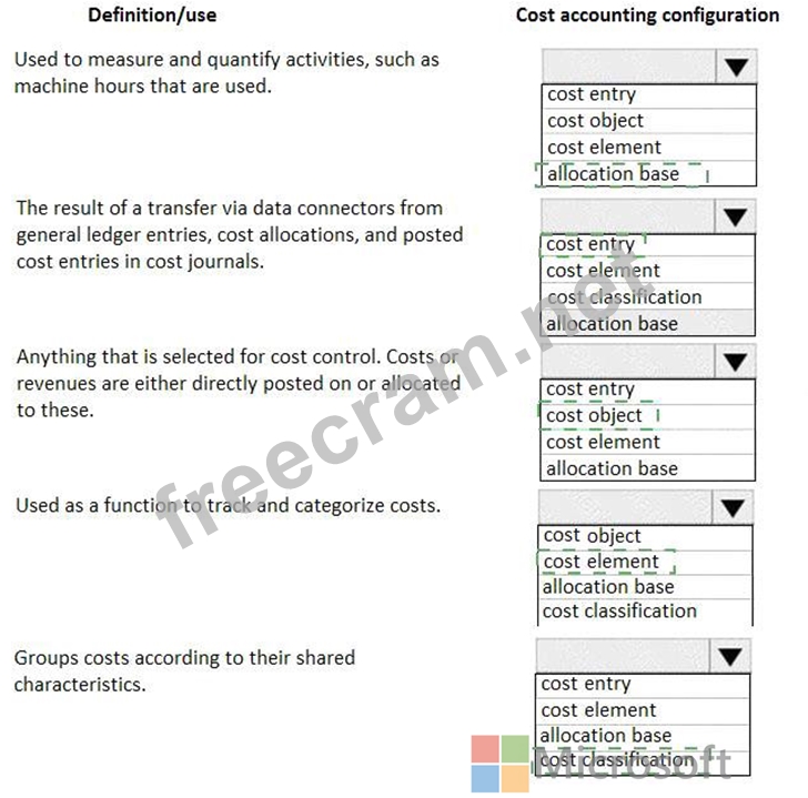 A client plans to use the cost accounting module in Dynamics 365 for Finance and Operations. You need to associate the correct definitions to the correct cost accounting concepts. Which terms match the definitions?