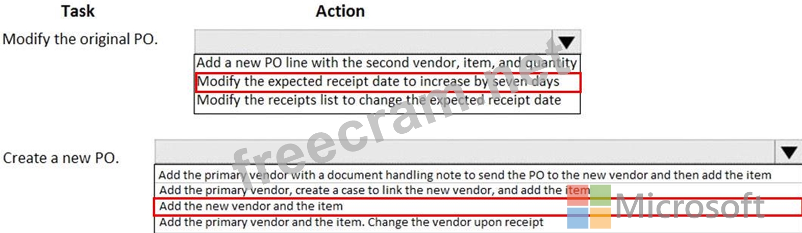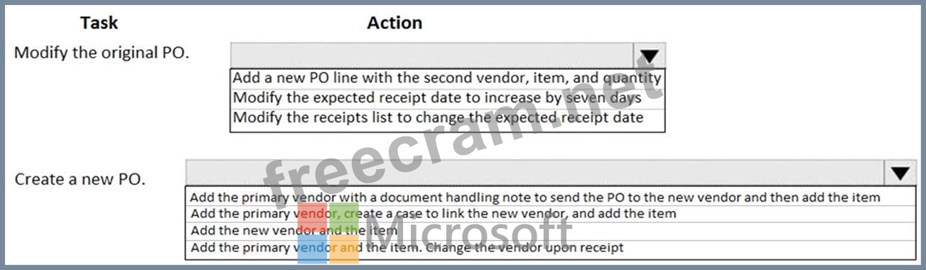 A primary vendor tells you that their purchase order (PO) items will be delivered seven days later than expected. You find another vendor that carries the product and can deliver it the next day. You need the purchases from both vendors, but only one PO exists in the system. You need to ensure that the system correctly reflects the inbound products from both vendors. How should you complete the setup? To answer, select the appropriate options in the answer area. NOTE: Each correct selection is worth one point. Hot Area:
