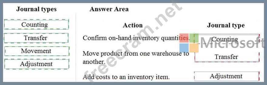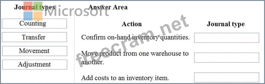 Which journal types should you use? To answer, drag the appropriate journal types to the correct actions. Each journal type may be used once, more than once, or not at all. You may need to drag the split bar between panes or scroll to view content.