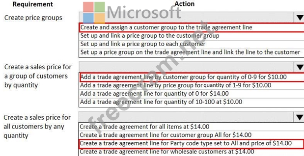 In Trade Agreement Setup, which actions should you perform? To answer, select the appropriate options in the answer area.