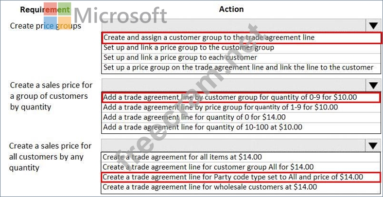 In Trade Agreement Setup, which actions should you perform? To answer, select the appropriate options in the answer area.