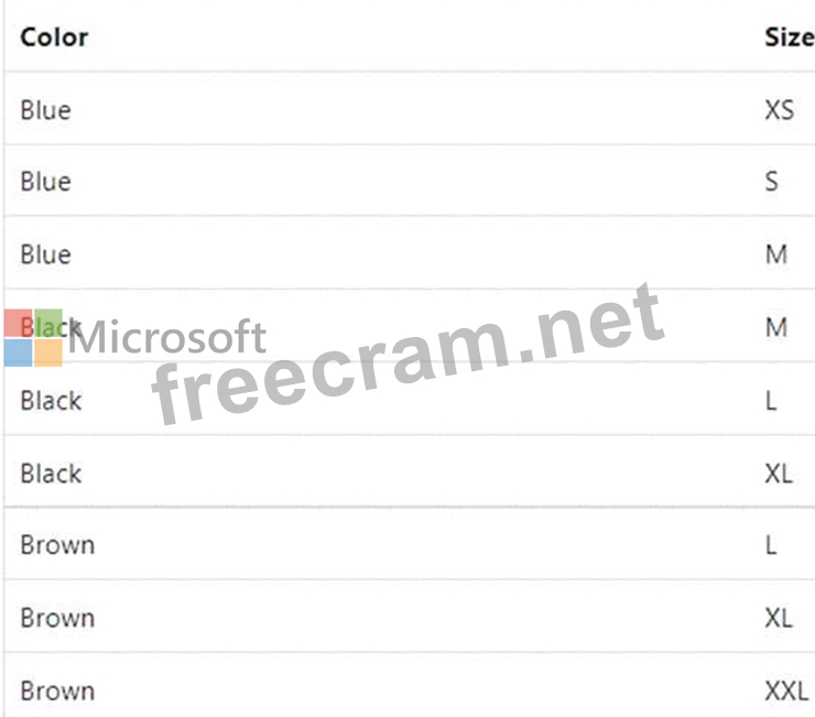 A company sells denim jeans. The item, Jeans, uses the color and size product dimensions. The jeans are sold in three different colors and six different sizes. The colors are blue, black, and brown. The sizes are XS, S, M, L, XL, and XXL. Not all sizes are available in all three colors. If all combinations were available, there would be 18 different types of jeans. However, in this example, only the following nine product variant combinations are produced.