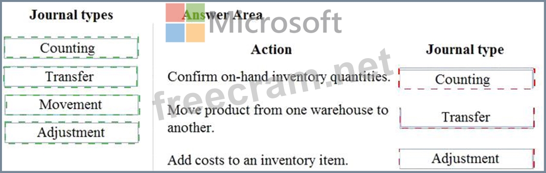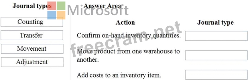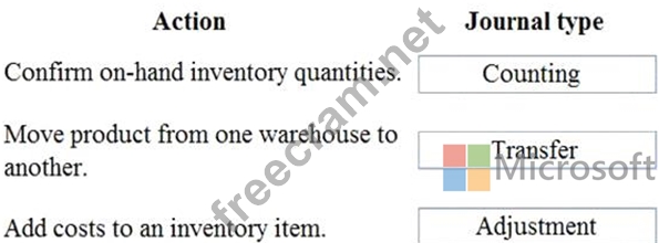 Which journal types should you use? To answer, drag the appropriate journal types to the correct actions. Each journal type may be used once, more than once, or not at all. You may need to drag the split bar between panes or scroll to view content.