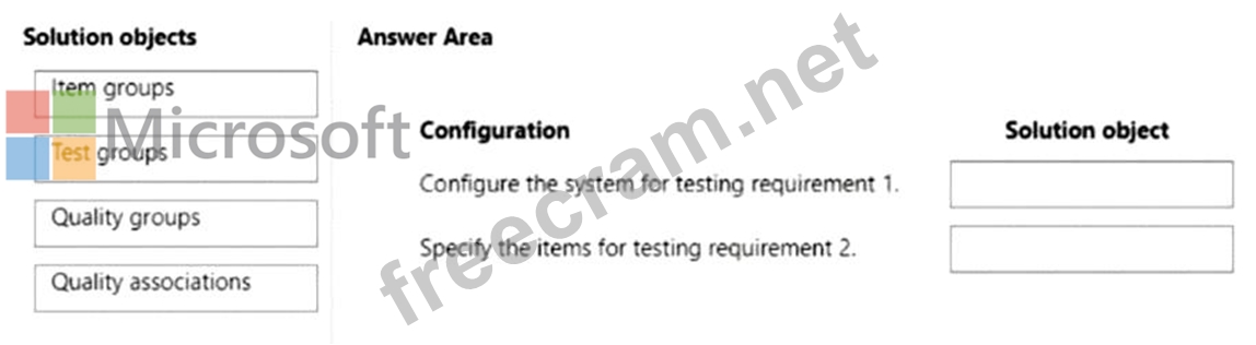 Which solution objects should you configure? To answer, drag the appropriate solution objects to the correct configurations. Each solution object may be used once, more than once, or not at all. You may need to drag the split bar between panes or scroll to view content.