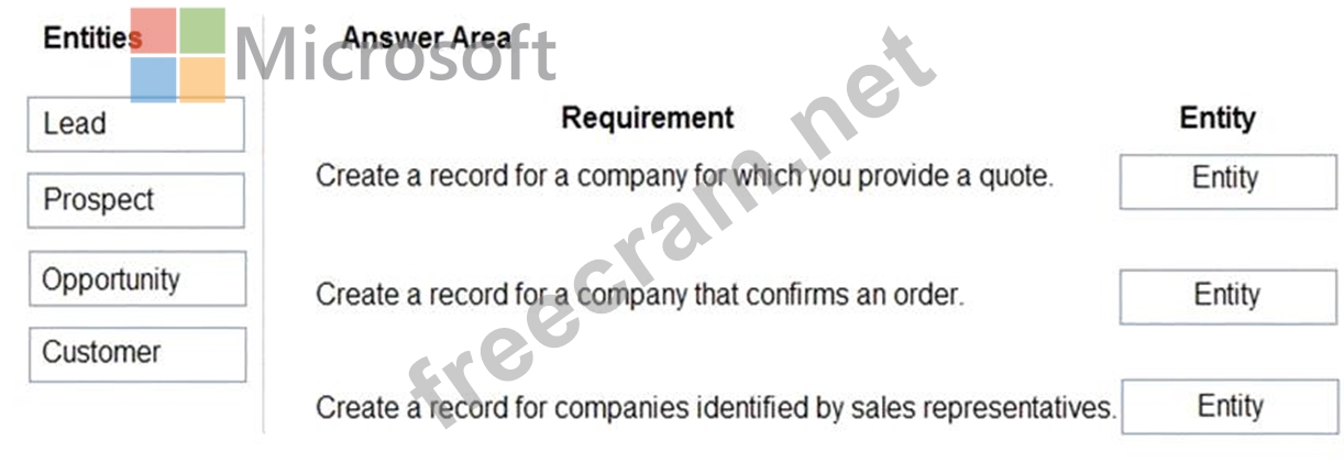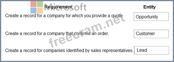How should you configure the system? To answer, drag the appropriate entities to the correct requirements.