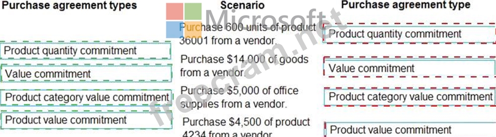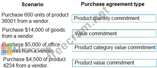Which purchase agreement types should you use? To answer, drag the appropriate purchase agreement types to the correct scenarios. Each purchase agreement type may be used once, more than once, or not at all. You may need to drag the split bar between panes or scroll to view content.