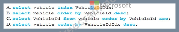 You have a table named FMVehicle that contains a field named Vehicleld. The table has a clustered index named Vehicleldldx on the Vehicleld field. You declare a table buffer named vehicle to refer to the table.
