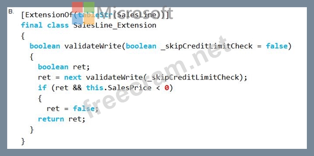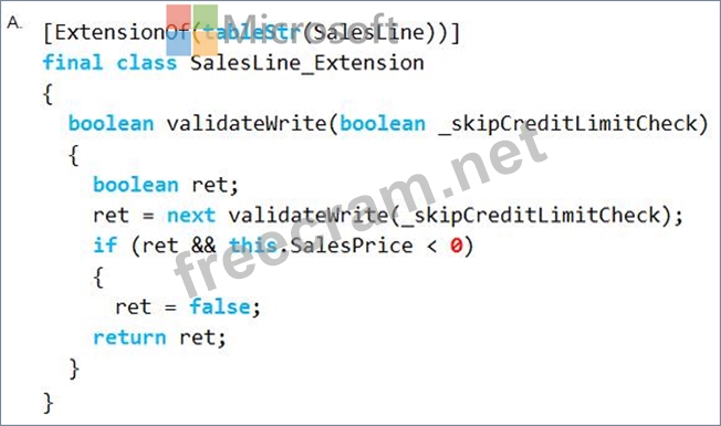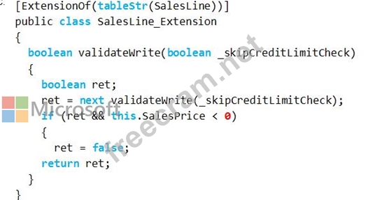 You must extend the validate method of the SalesLine table by using Chain of Command. The value of a variable named SalesPrice must be greater than or equal to zero when adding new lines.