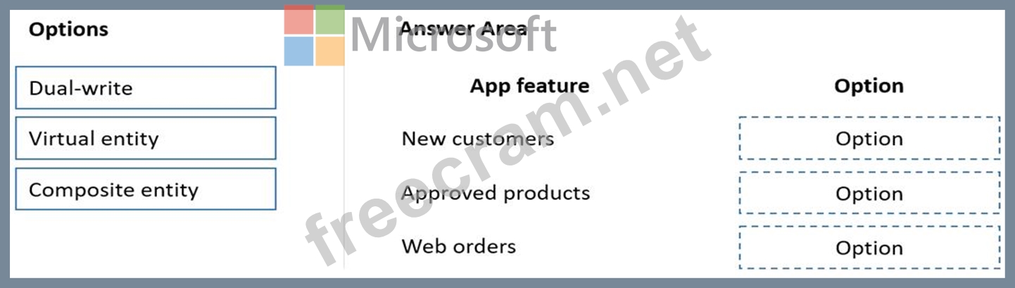What should you use? To answer, drag the appropriate options to the correct app features. Each option may be used once, more than once, or not at all. You may need to drag the split bar between panes or scroll to view content.